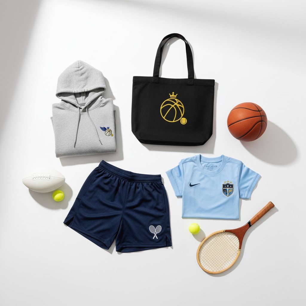 you’ll find a curated selection of premium embroidered apparel and accessories designed for Basketball and Football and Tennis fans, including: